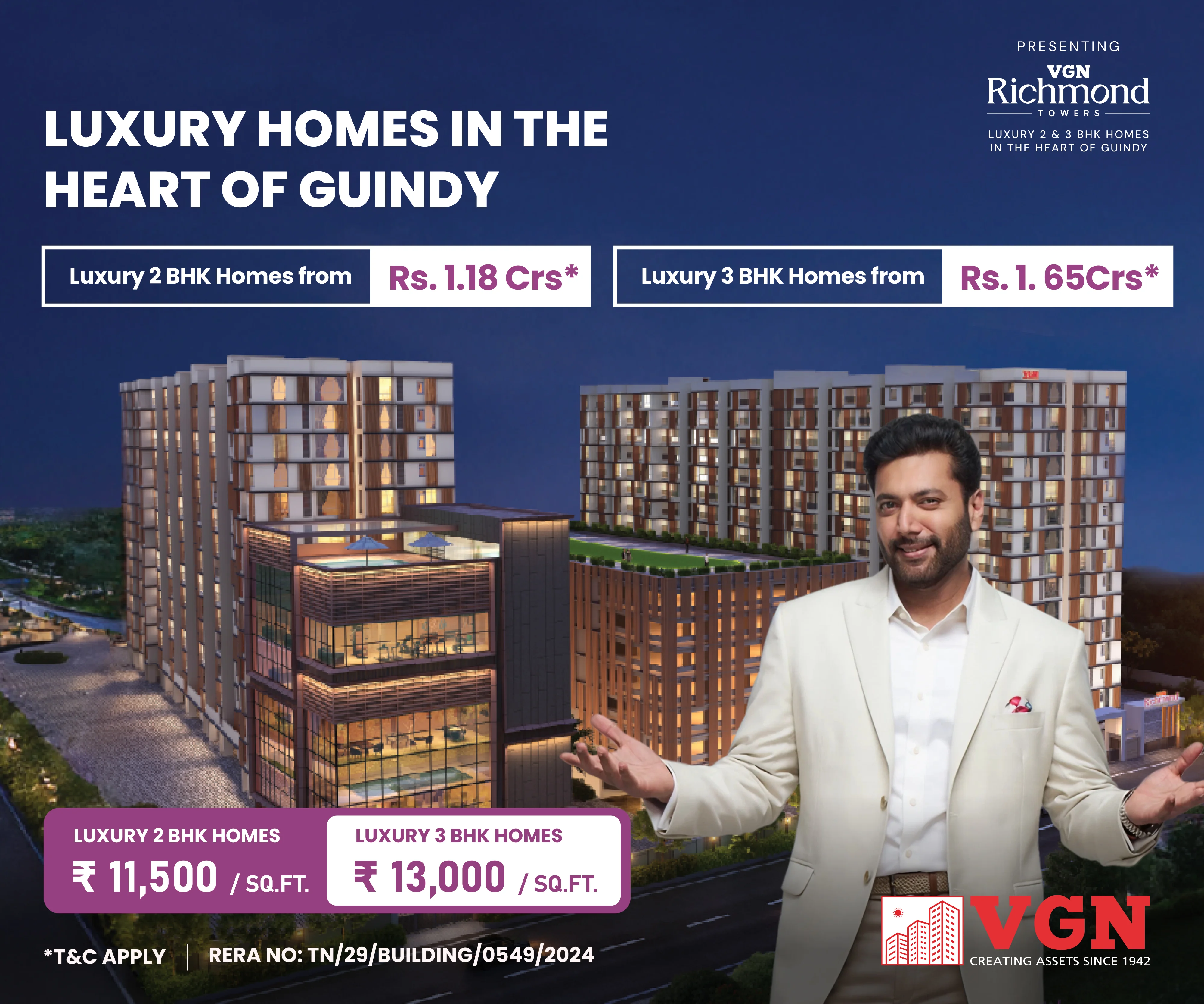 VGN Richmond Towers is strategically located in the heart of Guindy, just 1 km from Kathipara Junction, opposite Hotel Hilton, and Ekkatuthangal Metro Station is within walking distance. Out of 10.46 acres of prime land in the heart of Guindy, VGN Richmond Towers is offering 14 floors of luxurious 2 & 3 BHK residences with sophistication and convenience.